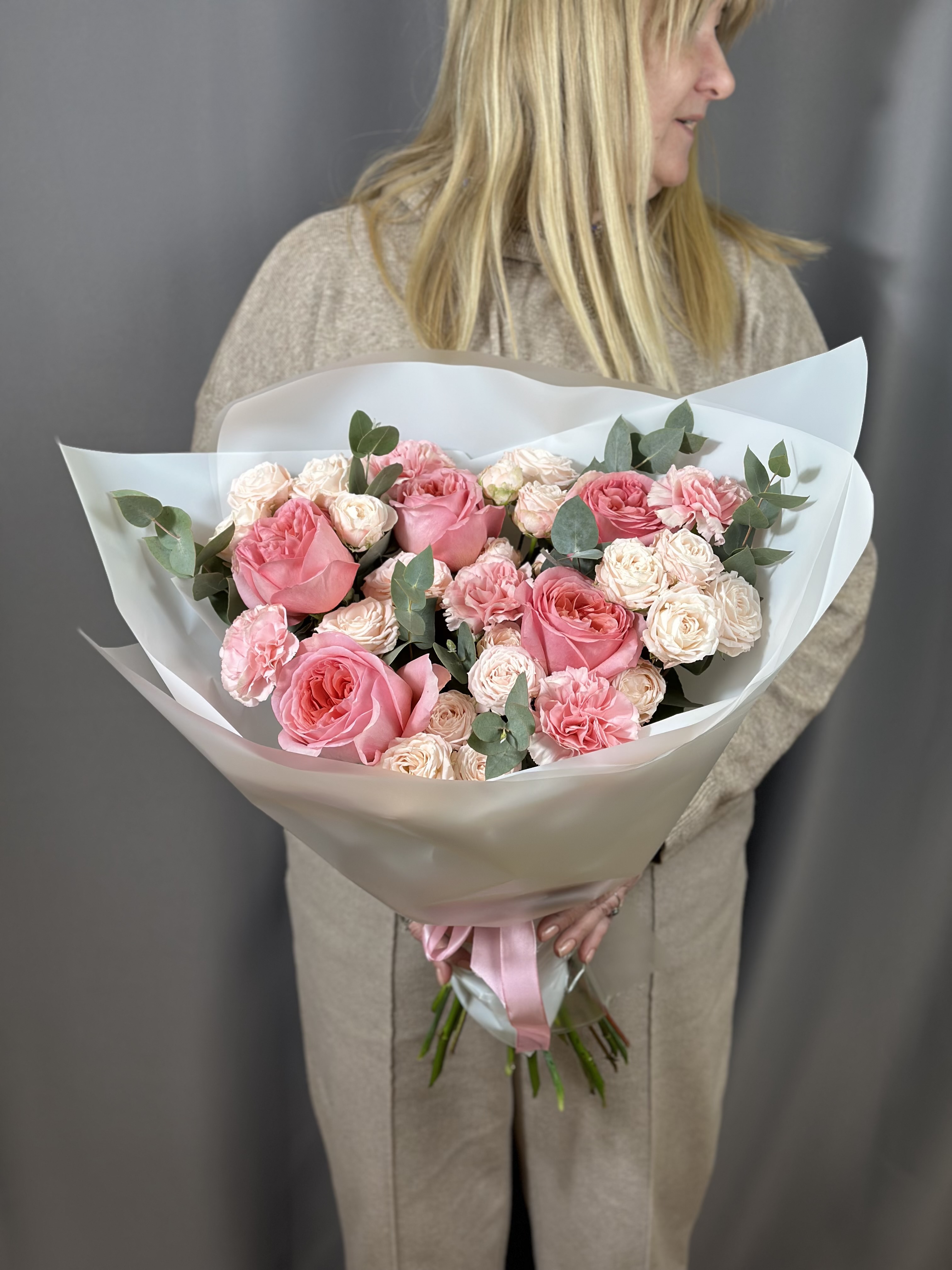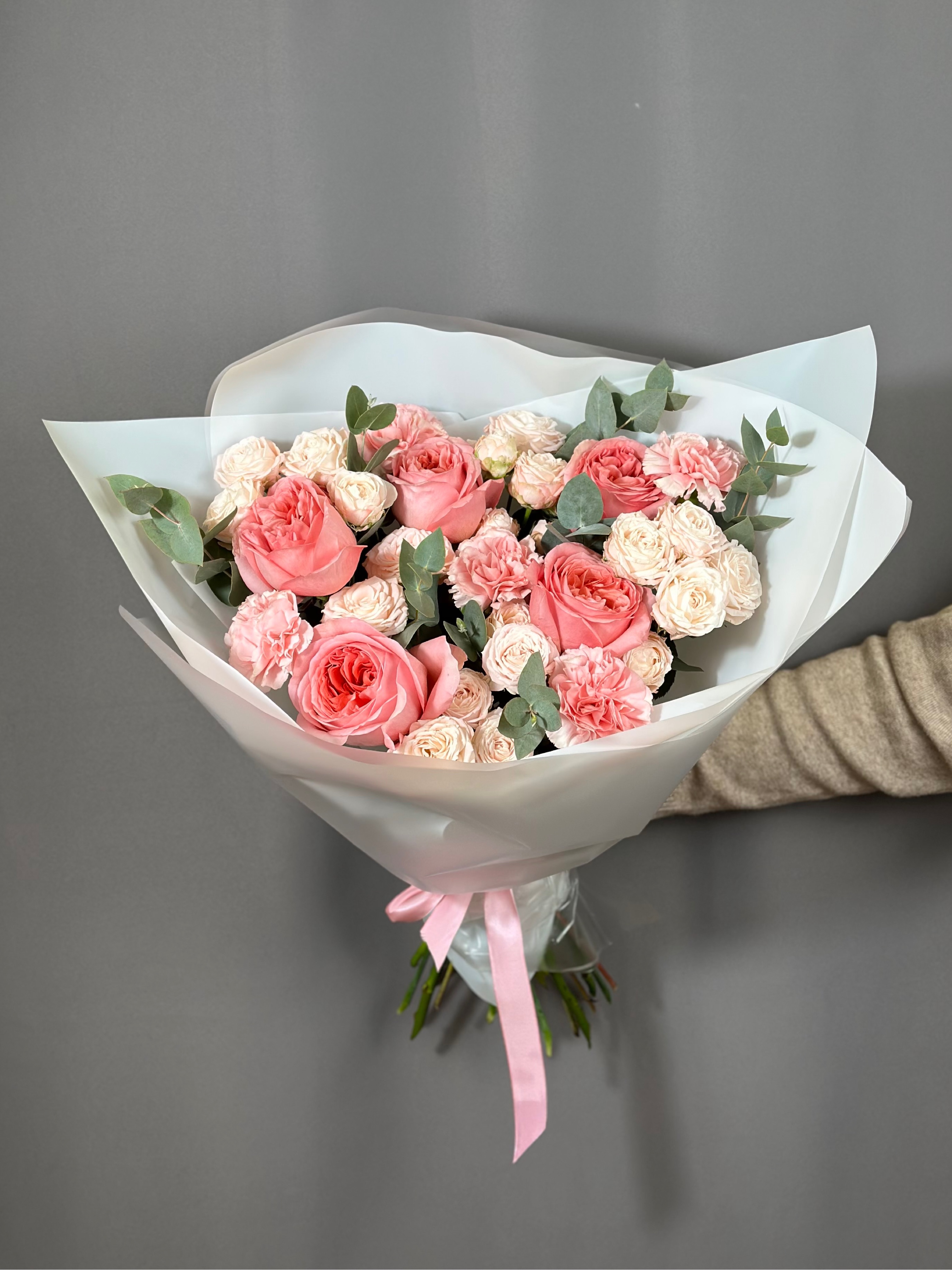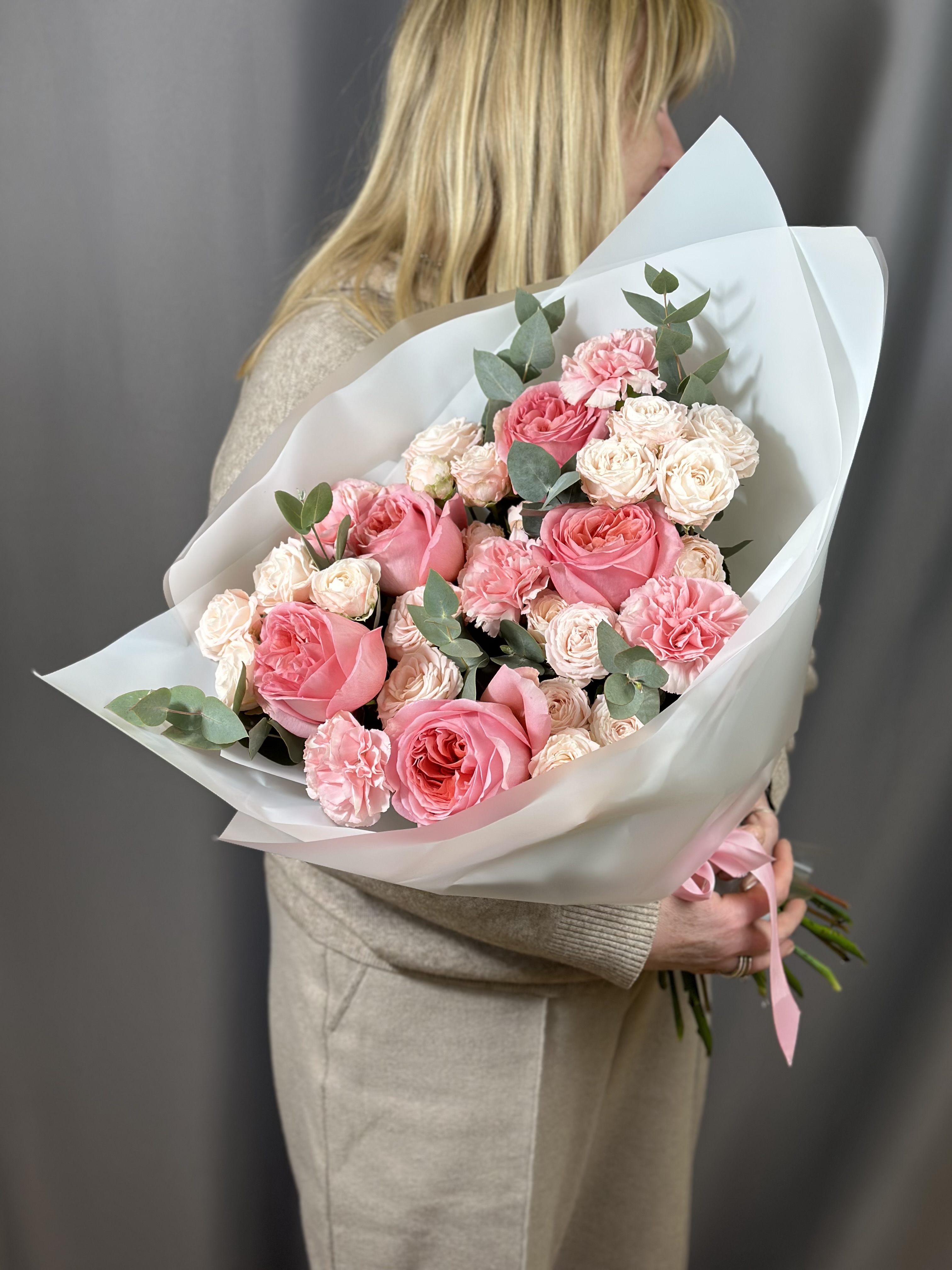 Свежесобранный букет в единственном экземпляре Собираем, фотографируем и сразу выкладываем на сайт. Можно заказать на сегодня завтра или послезавтра. Приедет тот самый букет с фото