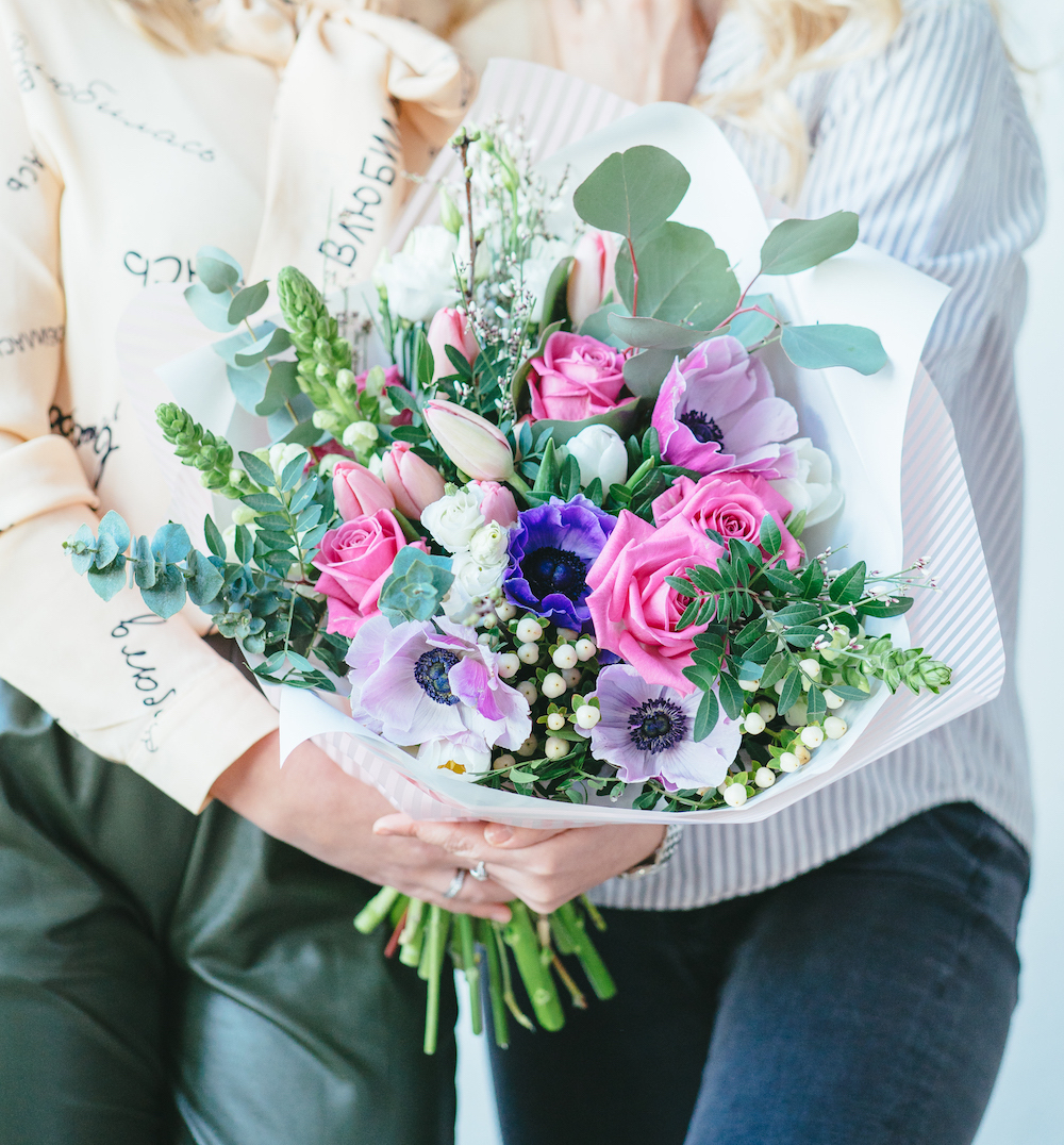 Анемоны, Антиринум, Розы Аква, Тюльпаны 2-х сортов, фисташка, гиперикум, душистая гениста и эвкалипт. Большой весенний букет, особенно подходит голубоглазым девушкам.